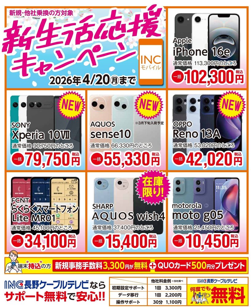 新生活の準備にスマホをお得にGET!!機種在庫は店舗でご確認ください。
