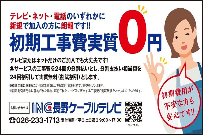 新規加入でお申し込みの方は、対象サービス(テレビ、インターネット、電話)を24カ月以上継続してご利用いただくと標準初期工事費が実質0円に!